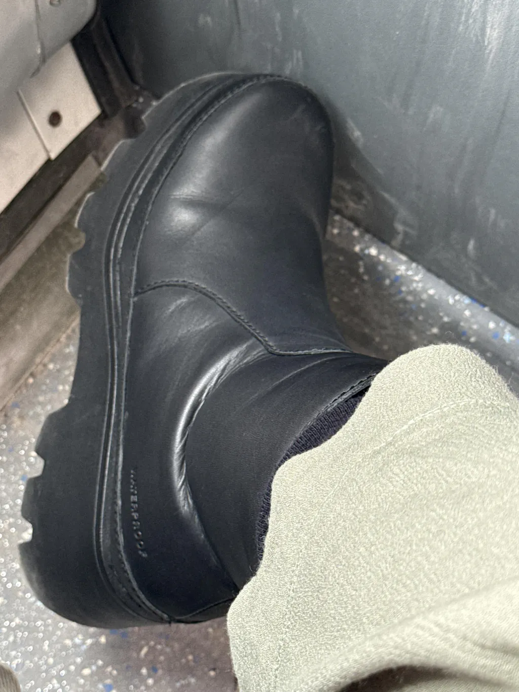 The black leather is nice and soft and not to glossy which I like also the chunky soles give plenty of traction, I would definitely order in different maybe lighter color if available.
